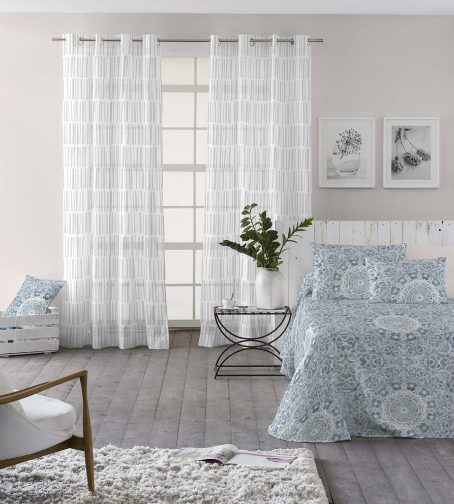 Colcha confeccionada con el tejido Camariñas azul y Visillo Arte.