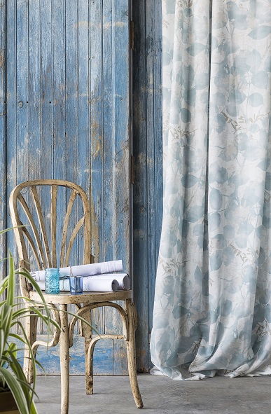 El suave estampado de hojas, junto a los tonos empolvados en color azul y piedra aporta un aire nuevo a la decoración del hogar.