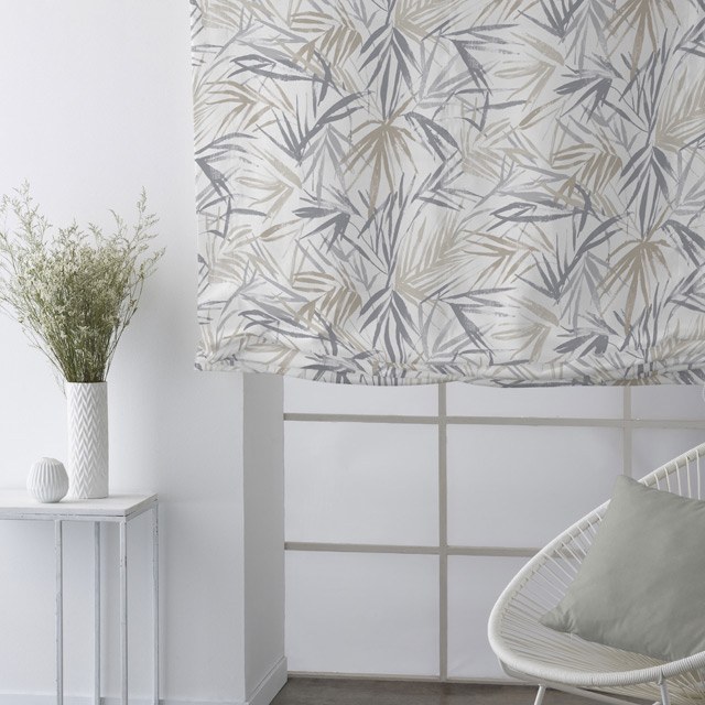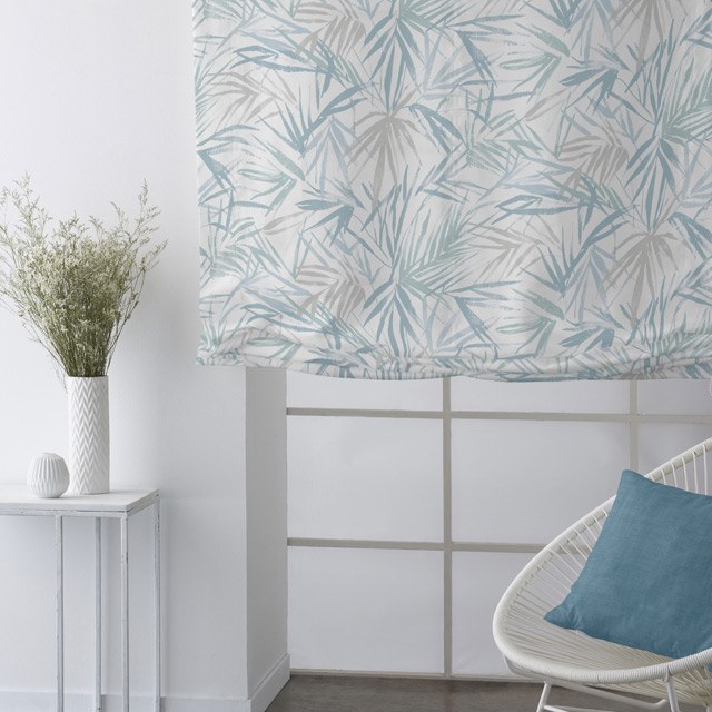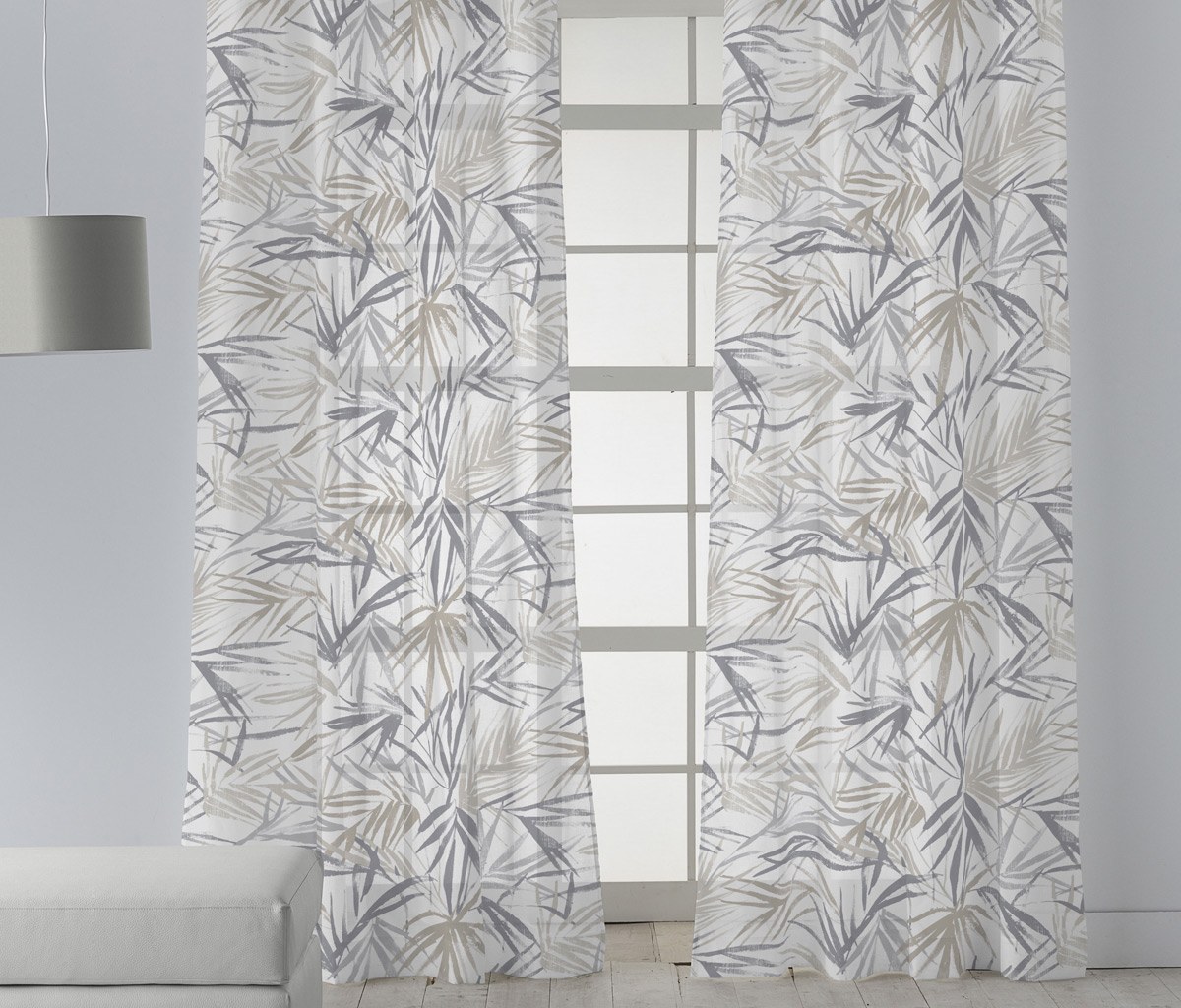 Tejido para Visillo estampado con hojas de Palmeras en tonos suaves que combinan con las decoraciónes y ambientes actuales.