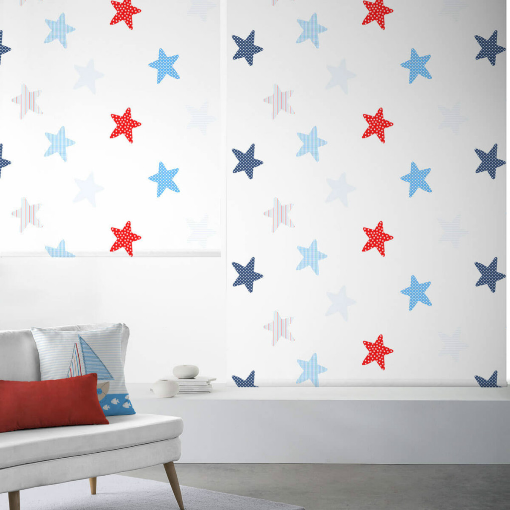 Tejido para Enrollables Playa con estrellas azules y rojas.