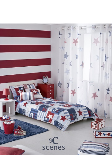 La colección de tejidos Austral está inspirada en el estilo de vida americano, alegre y desenfadado. Las telas combinan estrellas y números en colores rojo, azul y blanco para conseguir un ambiente muy actual.